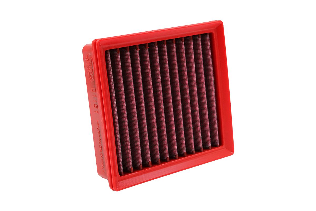 ll filtro aria BMC è composto da due strati di rete di alluminio con rivestimento epossidico posto a protezione della struttura della rete, che vincola il materiale filtrante in cotone oliato, disposto su più strati.Questo garantisce un elevato livello di efficienza filtrante e una minima perdita di carico, ovvero la differenza tra aria da filtrare e aria filtrata. L'olio utilizzato aiuta nella ritenzione delle impurità contenute nell'aria, permettendo una filtrazione continua. L'elemento filtrante in cotone è co-stampato all'interno di un telaio di supporto esterno che si inserisce direttamente nell'air-box e ne caratterizza la perfetta installazione. Ogni fase del processo produttivo (dalla progettazione alla produzione) è svolta in Italia da tecnici italiani utilizzando i migliori materiali.